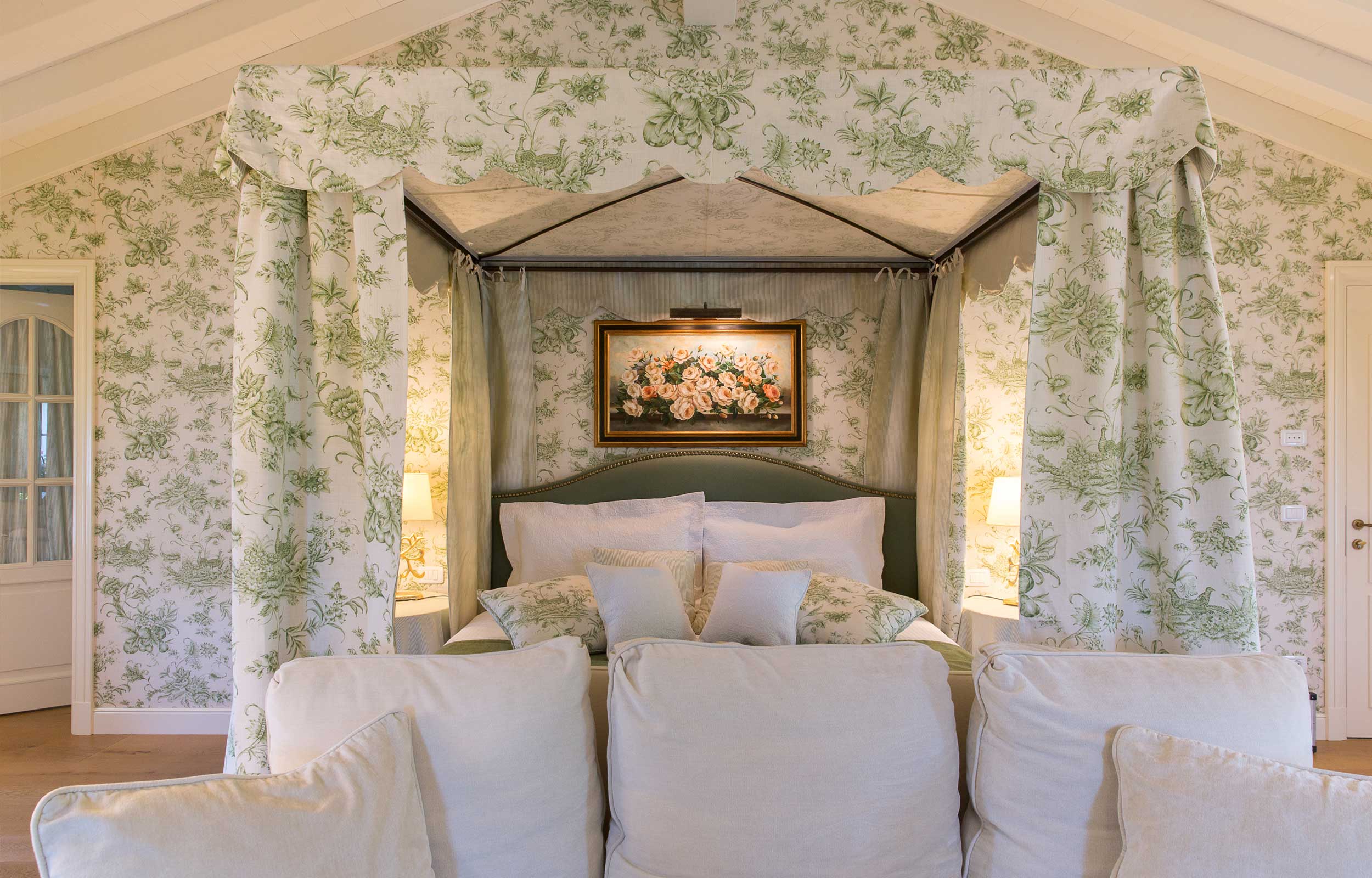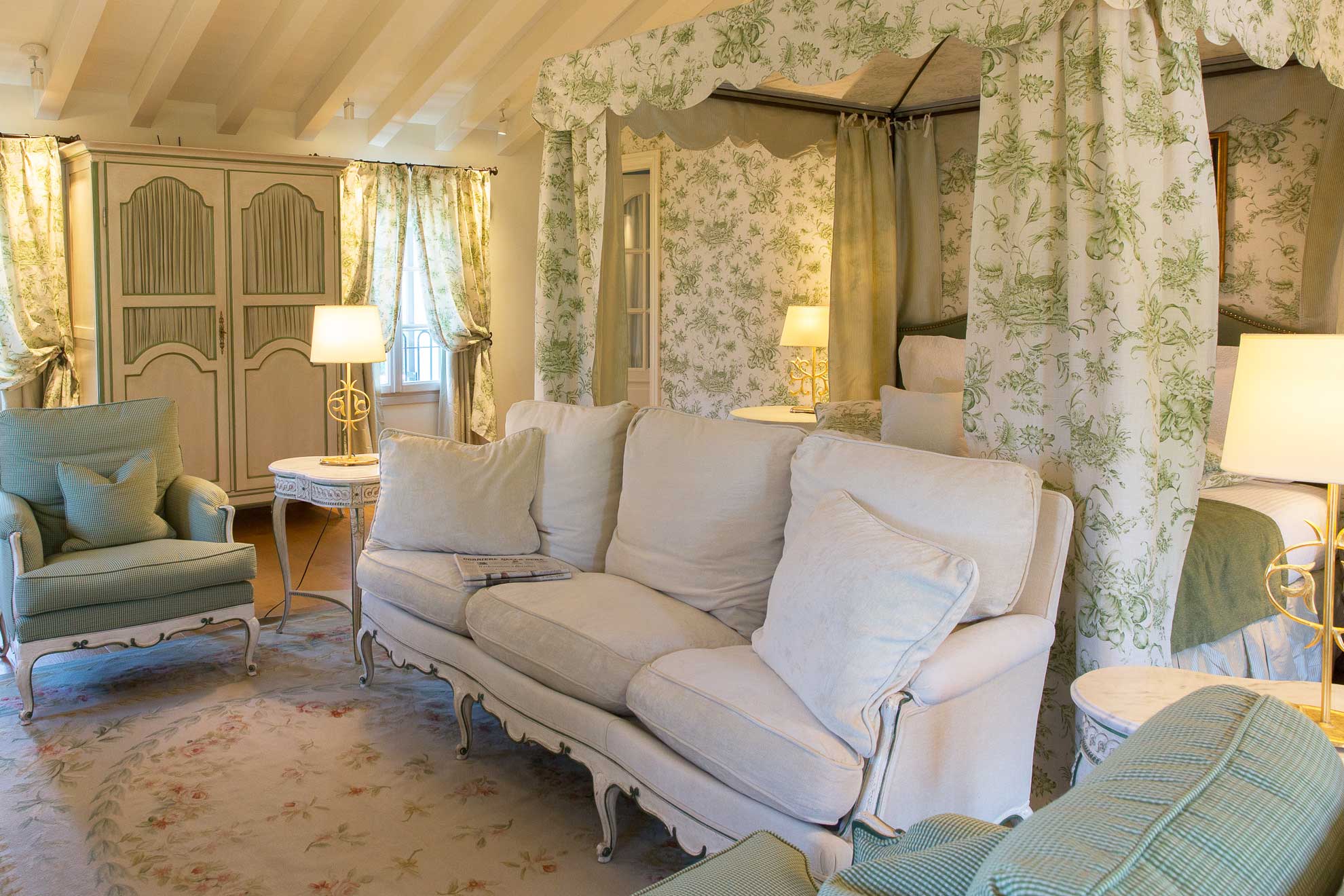 Hinter den King Size Betten mit Taschenfederkern-Matratze gibts eine Leinen-Tapete an der Wand. Die Wäsche und die Handtüchern sind von der italienischen Luxus-Marke Frette, es gibt Leinenvohange, sowie Verdunkelungsvorhaenge. Ein Wasserkocher fuer den Tee in der Nacht, oder einen schnellen Kaffee zwischendurch steht zur Verfuegung. Aufzug, Sateliten LCD TV, Minibar, Safe, Free WI-FI mit hoher Geschwindigkeit, Laermschutz.